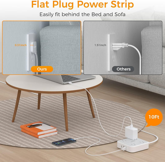 Flat Plug Surge Protector Power Strip - 6 Outlets and 4 USB Ports (2 USB-C), 5 Ft Flat Extension Cord for Home, Office, Dorm Room Use