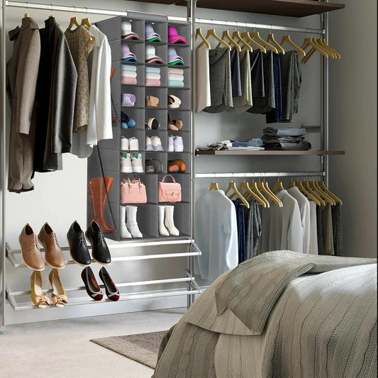 Hanging Shoe Organizer with 25 Sections and 4 Large Side Pockets for Closet Storage - Collapsible Shoe Rack in Gray