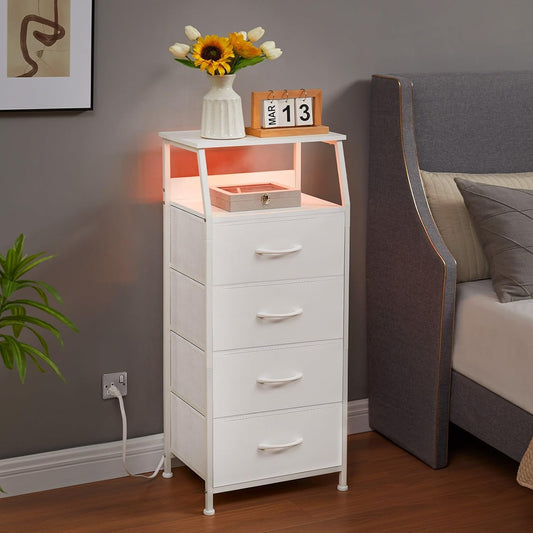 Nightstand Charging Station - LED Light Tall 4 Drawers Dresser - Fabric Bin, White Leather