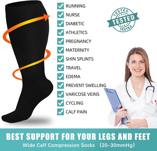Plus Size Compression Socks (20-30 mmHg) for Men and Women, Extra Large Knee High Stockings for Wide Calves - 3 Pairs