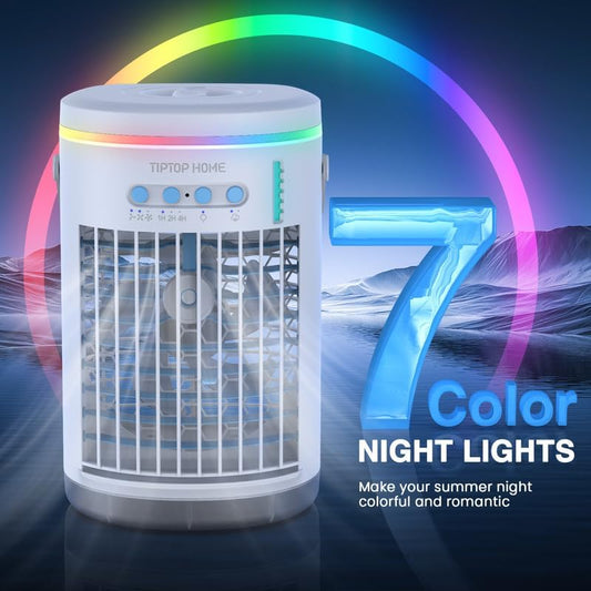 Portable 4-in-1 Rechargeable Air Conditioner Fan with Humidifier, 3-Speed Evaporative Cooling, 7 Color LED Lights, 1400ml Cordless Desktop Spray Fan, and Remote Control