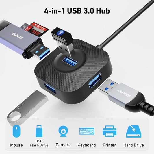 USB 3.0 Ultra Slim 4-Port Hub for Laptops and Devices - , XPS, PS5, PC, Flash Drives, Mobile HDD (Black, 0.5 Ft)