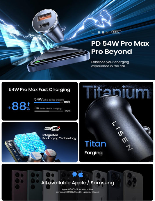 USB-C Car Charger Adapter - 54W Fast Charging - Compact All-Metal Design, PD 36W - Black