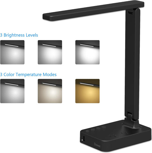LED Desk Lamp, Desk Light with 1 USB Charging Port and 2 AC Power Outlet, 3 Lighting Modes, 3 Level Brightness,1H Timer, Touch Control (Black)