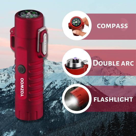 Rechargeable Dual Arc Plasma Lighter - Flameless, Waterproof, Windproof with LED Flashlight for Outdoor Use - Gift Box Included (Red)