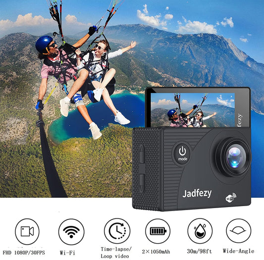 Sports Camera - Wide-Angle Lens, Ultra HD 1080P WiFi Action Camera, 12MP 2" LCD Screen, 30M Waterproof Capability, 2 Batteries, Accessories Kit