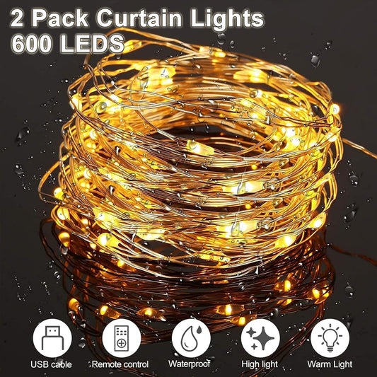 Curtain Lights, 600 LED Fairy Lights, 12 Modes Waterproof String Twinkle Lights, USB Powered Hanging Lights