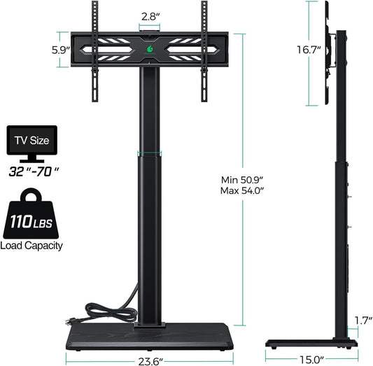 Height Adjustable Swivel TV Stand - Power Outlet for 32-70 Inch TVs, Wood Base, Supports up to 110 lbs, VESA 600x400mm, Black