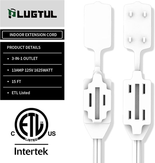 15-Foot Indoor White Extension Cord with 3 Polarized Outlets, 16 Gauge, 2 Prong, ETL Listed, Safety Cap