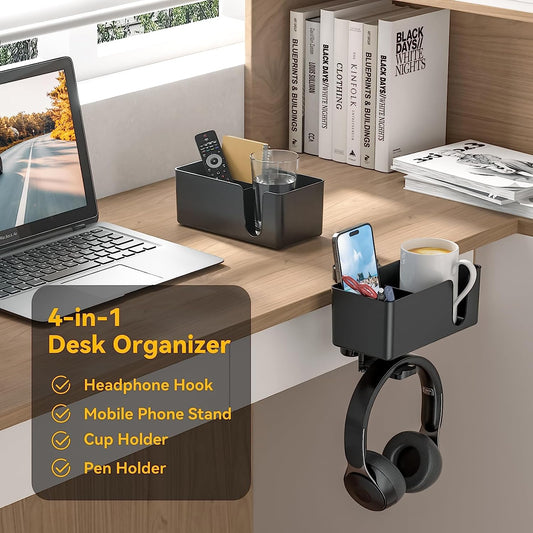 4-in-1 Desk Organizer with Under-Desk Headphone Hook, Dual Wire Holes, Rotating Headphone Hanger, Detachable Storage (Black)