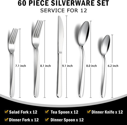 60-Piece Stainless Steel Flatware Set for 12, Includes Knives, Forks, and Spoons, Dishwasher Safe