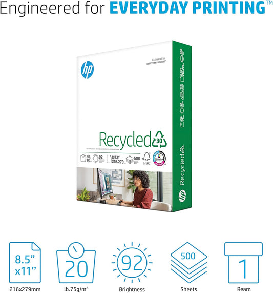 HP 8.5x11 Recycled Printer Paper, 20 lb, 30% Postconsumer Content, 500 Sheets per Ream, 92 Bright, FSC Certified, Made in USA