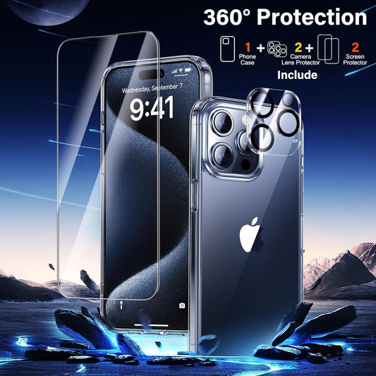 5-in-1 Case for iPhone 15 Pro Max - 2 Tempered Glass Screen Protectors - 2 Camera Lens Protectors, Shockproof, Anti-Scratch - Clear