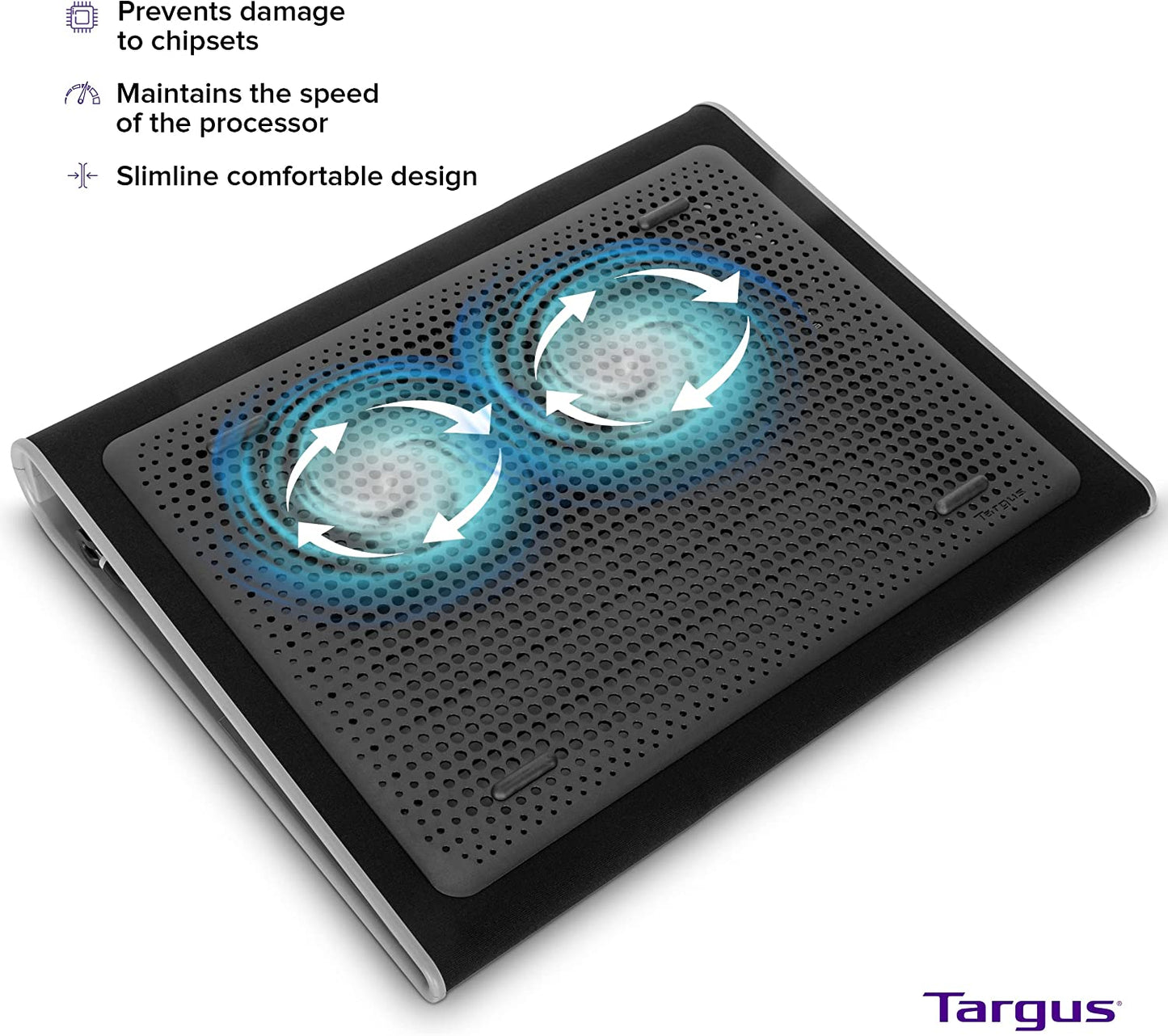 The Targus Lap Chill Mat provides a comfortable and ergonomic work surface to keep you and your laptop cool. The Chill Mat rests on your lap and disperses heat, using dual fans to provide ventilation which can be obstructed if the laptop is used on a pillow or comforter. Simply plug the USB connector into the laptop to activate cooling. The ergonomic tilt makes typing easy while the soft neoprene material provides cushioned comfort on your lap. The open design allows fans to run quietly and stimulates constant airflow. Four rubber stops on the face of the Chill Mat prevents the laptop from slipping. The Targus Lap Chill Mat makes using your laptop an enjoyable experience. Protection - Protects lap or work surface from heat. Function - Dual fans help disperse laptop heat for improved functionality; extends the life of the laptop. Material - Soft neoprene exterior provides added comfort on your lap. RoHS Compliant - Yes **Please be advised that new Targus product should arrive in sealed retail packaging as shown in the image gallery.