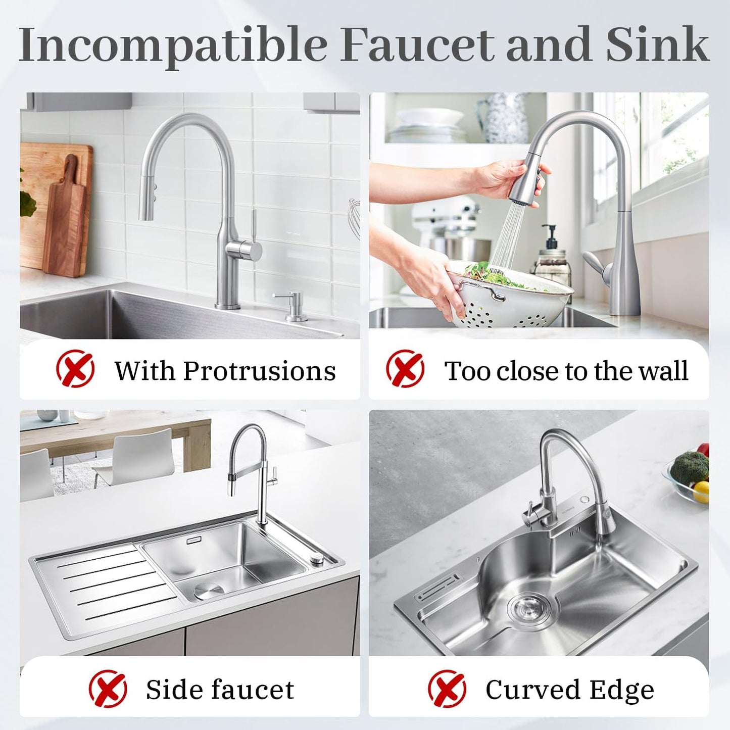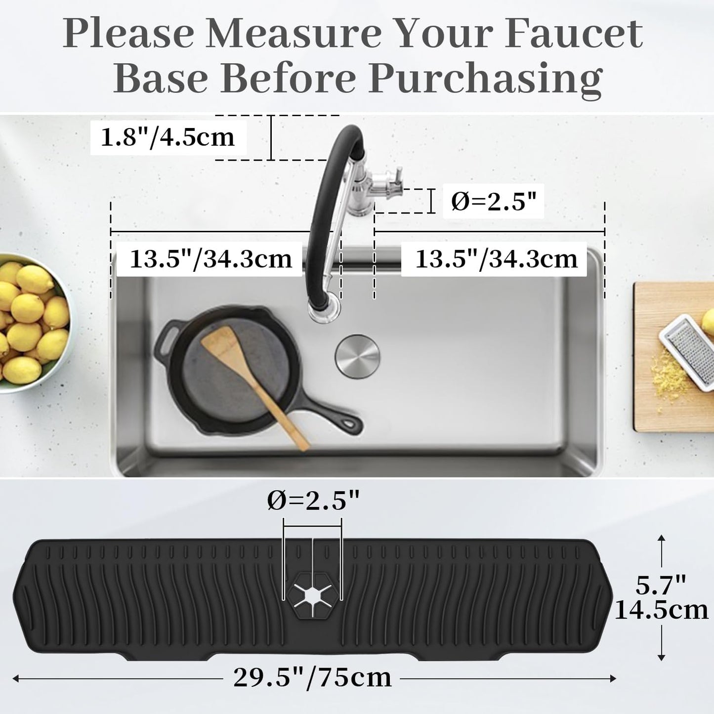 - 【Measure Before Purchasing】 Please measure the faucet and sink size before purchasing to ensure a perfect fit! The size of faucet splash guard is 29.5" x 5.7" , The diameter of faucet hole is 2.5 inches. The silicone draining mat for sink can be used in all faucet base less than or equal to 2.5 inches