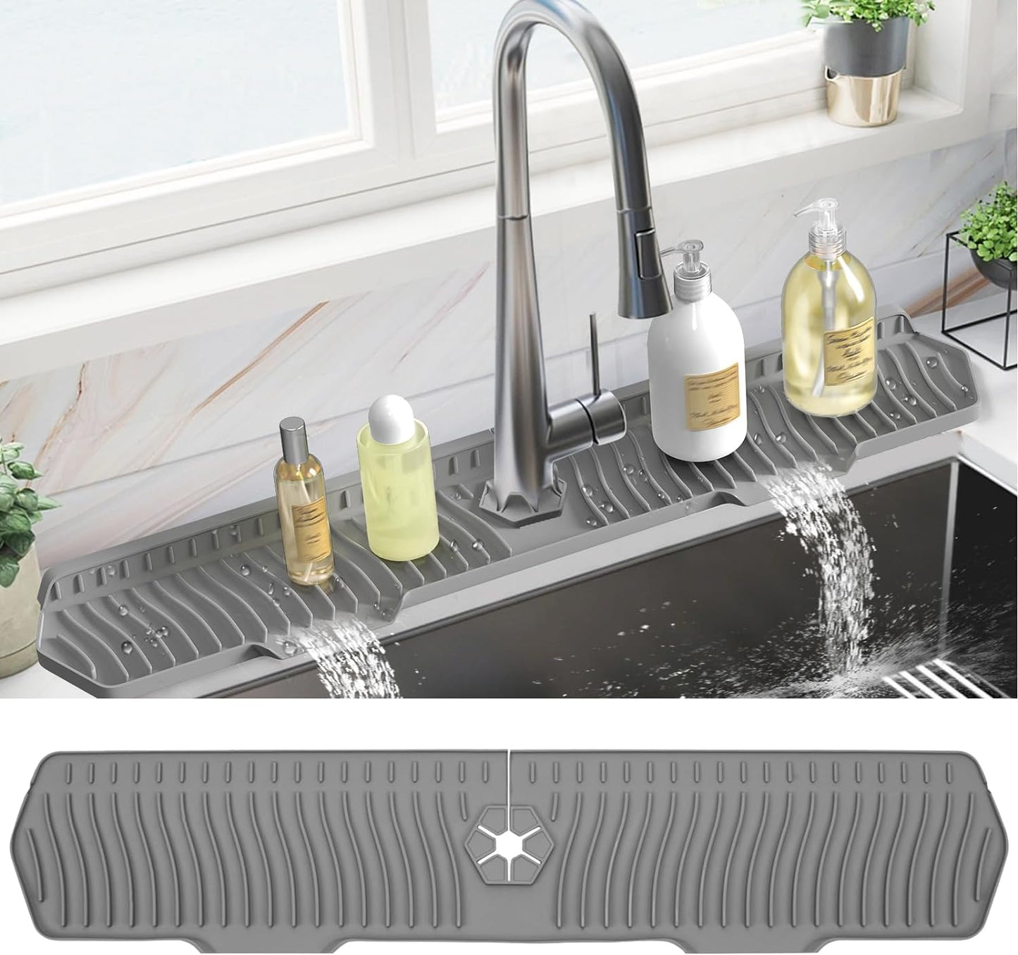 - 【Use as an Organizer Mat】The splash guard has enough room in each side for soap, scrub brush, sponges and soap dispensers. The silicone mat allows the water from sponges to drip into the sink and keeps water off the granite! And silicone faucet drainer pad prevents soap dispensers from leaving stains on kitchen counters.