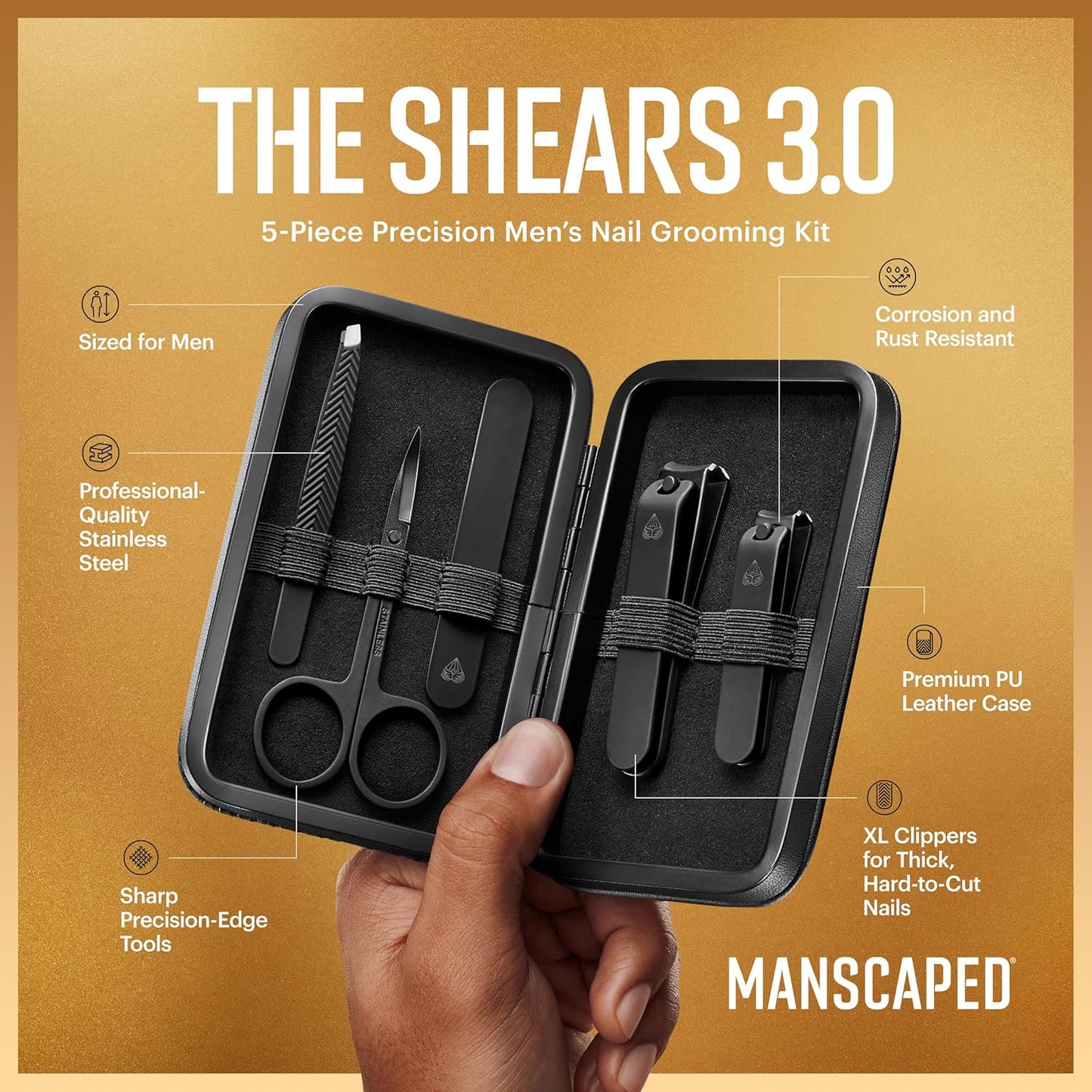 - THE SHEARS 3.0: All your nail care grooming essentials come kitted in a travel-friendly, water-resistant hard case with a magnetic closure. Inside, each stainless-steel tool is held firmly in place so you can toss it in your gym bag or carry-on with confidence.