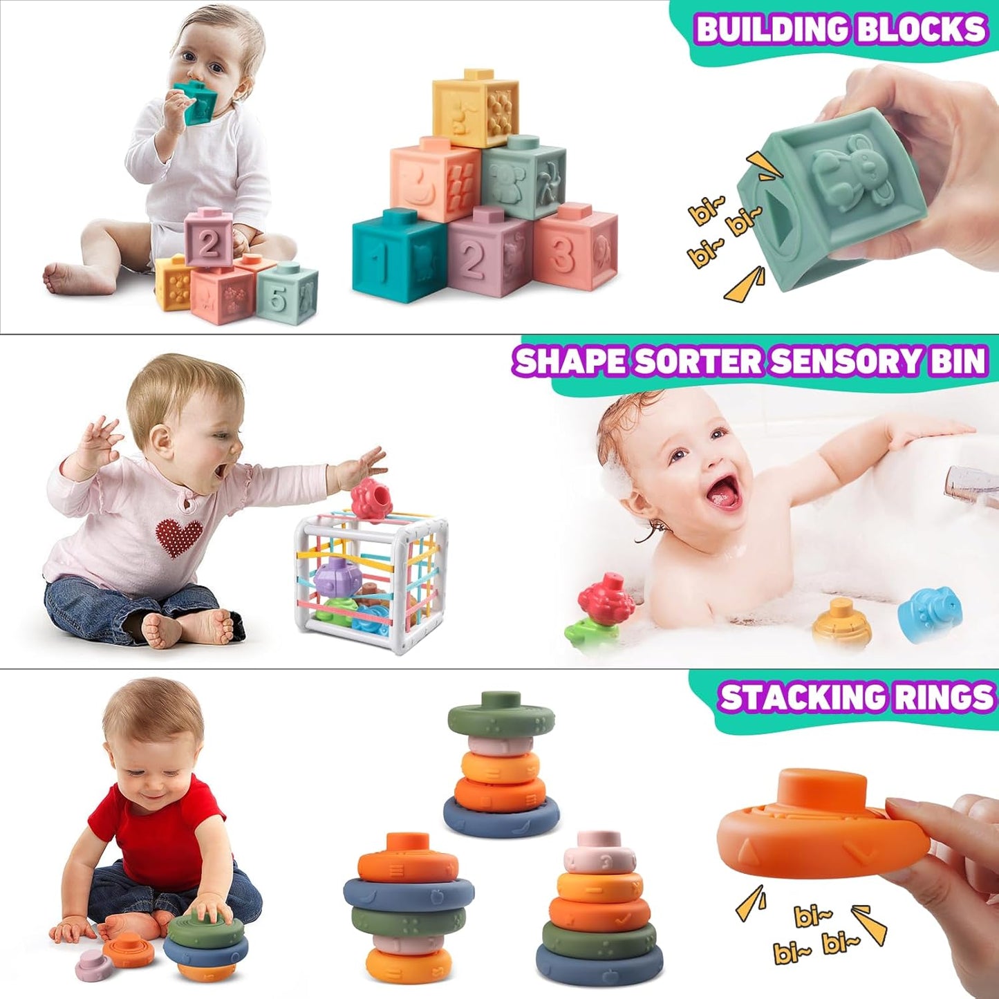 - 6 in 1 Baby Toys Set: This montessori toys set contains 6 soft building blocks, 5 soft stacking rings, 6 matching eggs, 3 suction cup toy, 1 crab shape sensory toy, 1 explore sensory bin with 6 blocks. Comes with a large capacity storage bin for children to learn organizing skills. Nicely packaged, great gift choice for babies.
