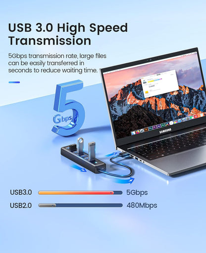7-Port USB 3.0 Hub with 3.28Ft Extension Cable, 5Gbps High-Speed Data Transfer USB Splitter for Laptops, PCs, Flash Drives, Printers, Mobile HDDs
