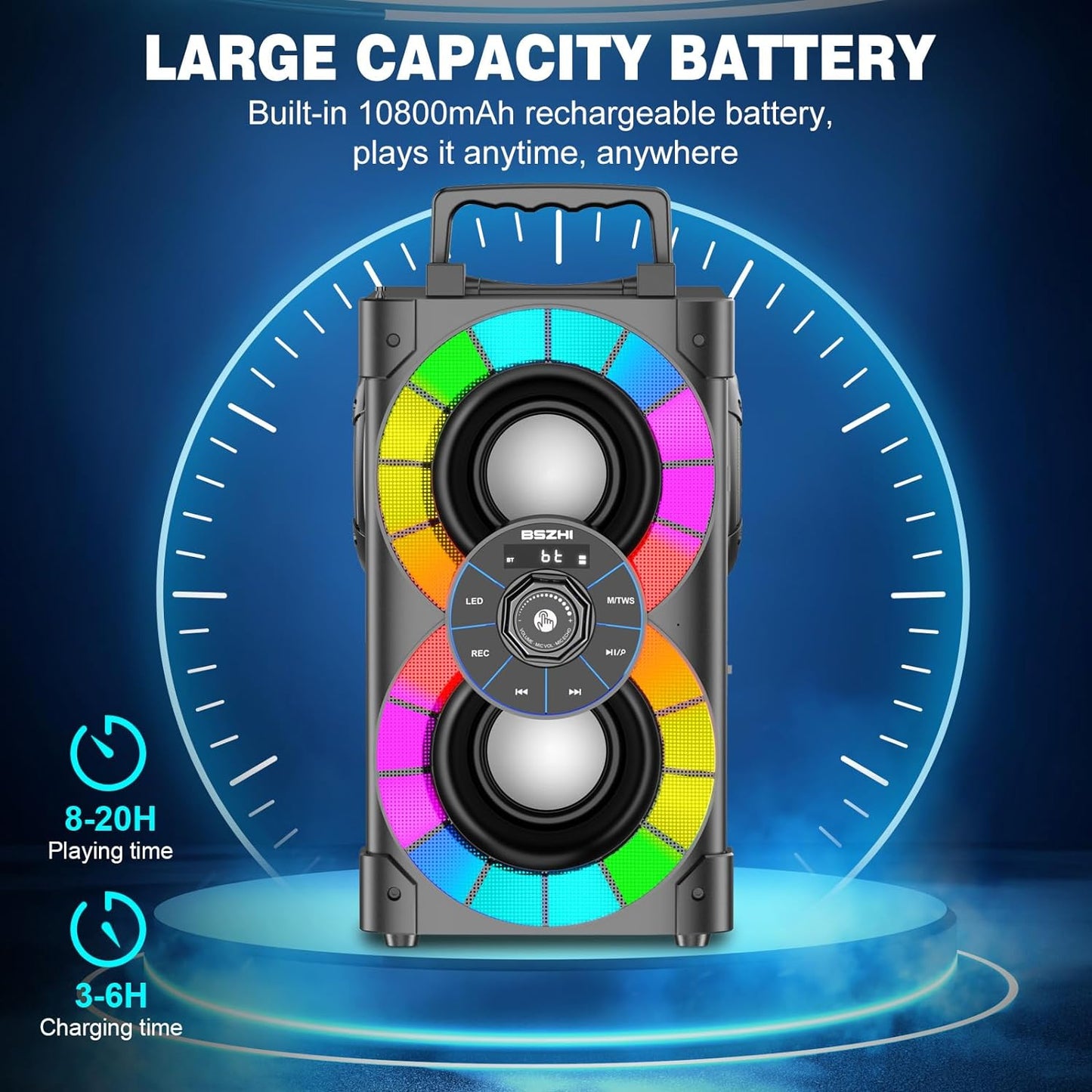 - ♫ 【Multi-function Party Speaker】 The A80 portable bluetooth speaker support TWS, FM radio, TF Card music playback, AUX input, U-disk music playback, remote control and 6.35MM Microphone jack. It's built-in 10800mAh rechargeable battery, providing up to 8~20 hours play time ( depends on playing volume). You can enjoy the carnival whether it is an indoor or outdoor dance party. This big bluetooth speaker is great for camping trips, barbecues and even singing karaoke, weddings, conferences etc.