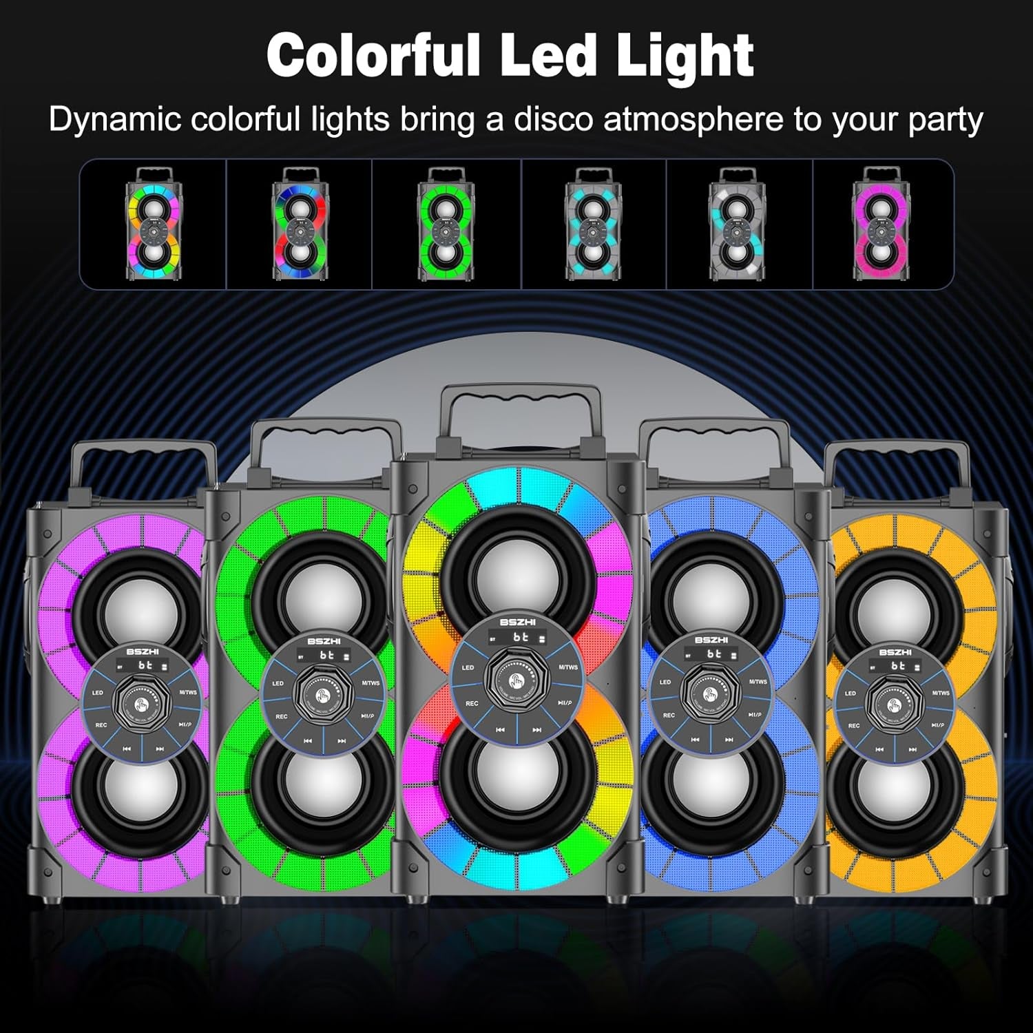 - ♫ 【Bluetooth speaker with lights】 The A80 party speaker is designed with multiple dynamic light modes to light up every corner of the party space, and Colorful LED lights can change the lighting effect according to the rhythm of music, which colourful and vibrant can give your home party, beach, camping or outdoor travel an exciting atmospher. You can easily turn on and off the LED lights with long press one button.