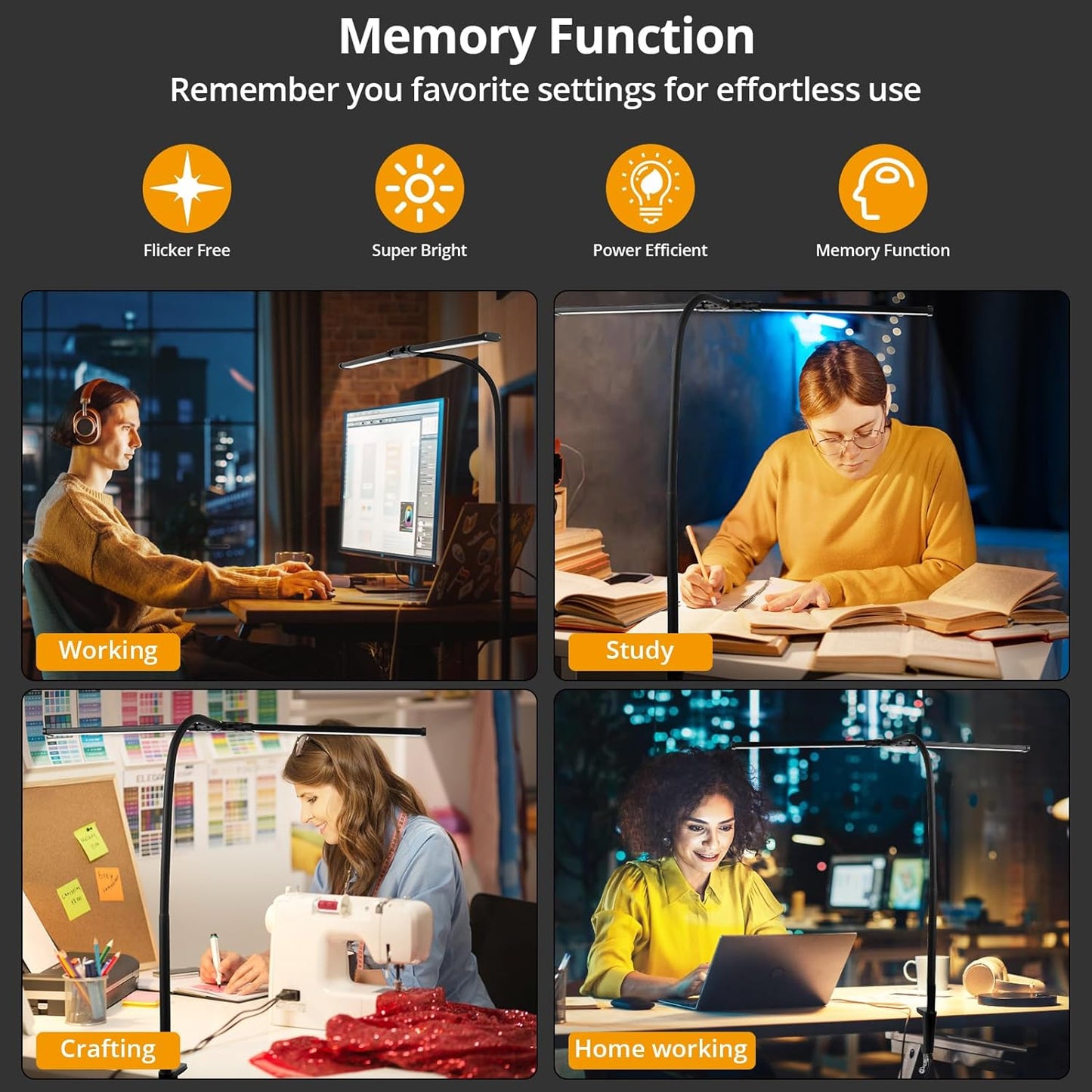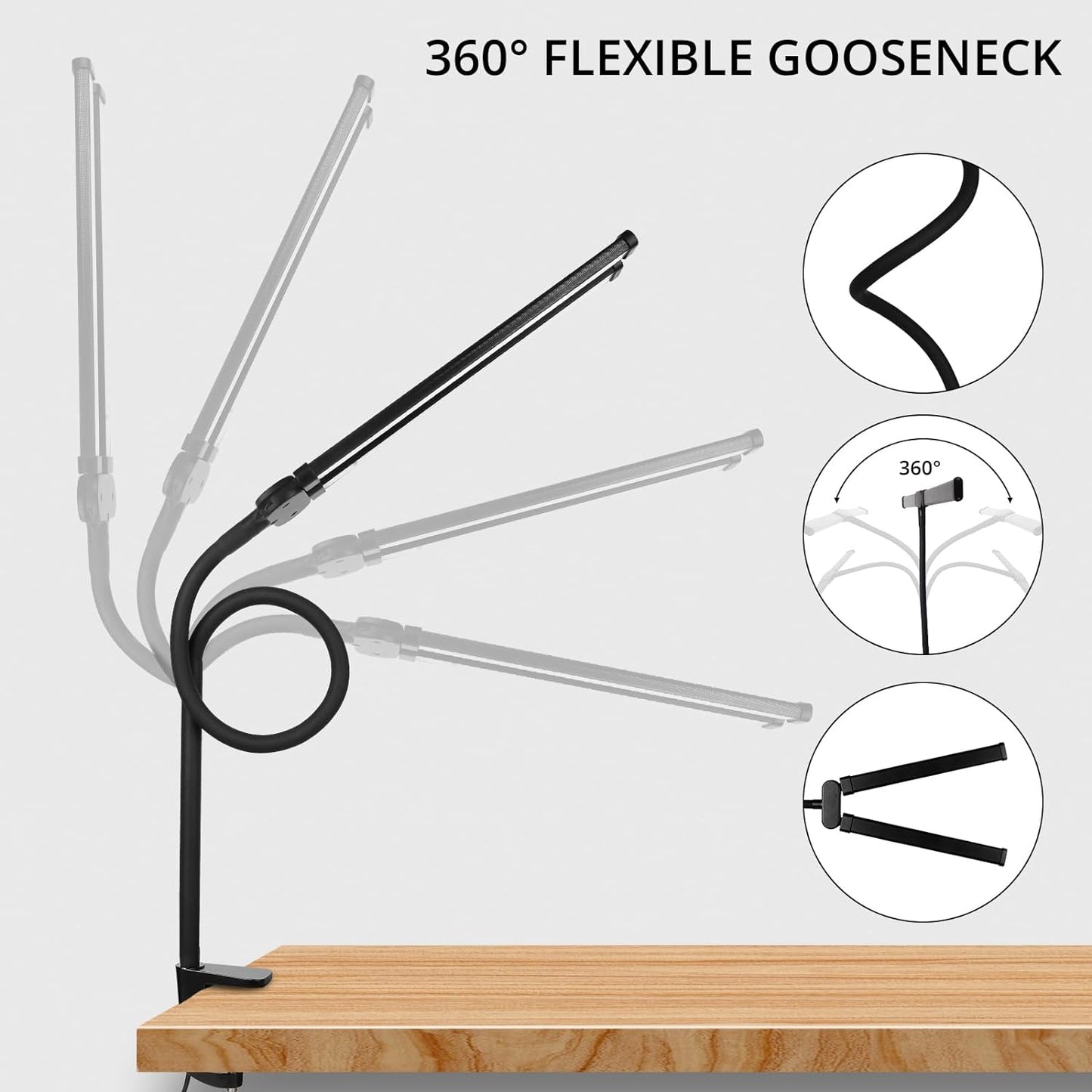 - 【Adjustable Dual Head and Long Flexible Gooseneck】-- dual head / two arms design for maximum and flexible coverage, can cast the desk light to a bigger area instead of a single-point light bulb, double head's whole longth 24inch - single head 10.5inch; The tall desk lamp of 7.87inch height metal solid neck and 15.7cinch adjustable neck, allows us to direct light to two different areas, then to make our workspace more comfortable and productive; Good for adding more light to desk, table, workspace...