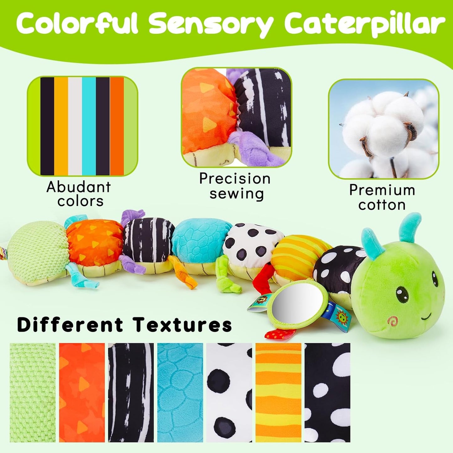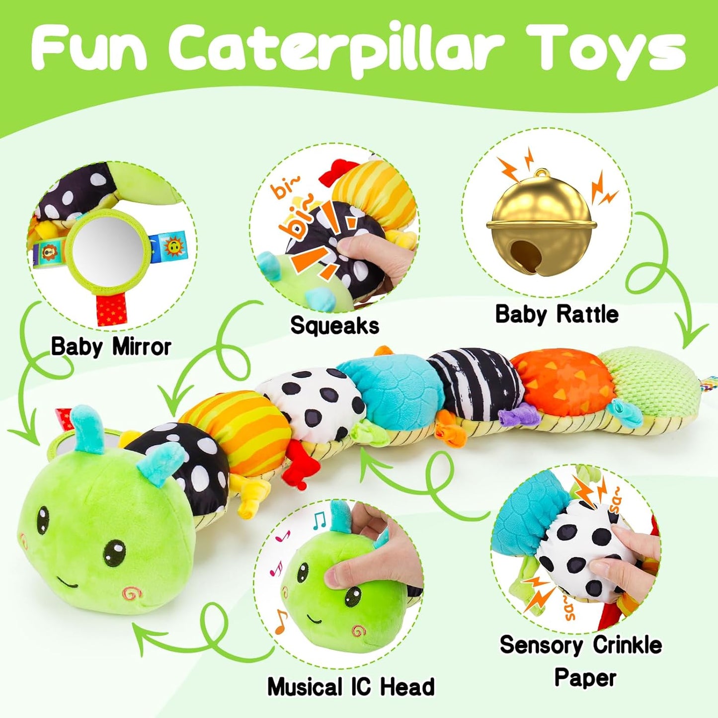 - Sensory Musical Toys: Our baby sensory toys is designed with 7 gorgeous colors, it is very good for the baby to know the colors. The baby musical toy has 4 different sounds: 1x music IC (with one song) in the head; 1x BB squeaks, 2x crinkle sound paper on the back and 1 x rattles in the caterpillar tail. Every section of the body has some sort of sensory stimulant associated with it (music, rattle, squeaky toy, crinkle paper, fun pattern. It is an awesome sensory toys for babies 0-6 months. Great baby toys 4-6 months.