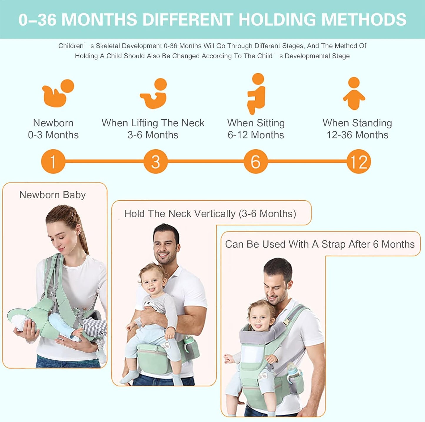 - Ergonomic Design: 6-in-1 carrier is equipped with an adjustable waist stool, harness and backboard, which can be matched and combined according to your needs. It is recommended for babies aged 6-36 months. The waist stool can bear a maximum weight of 66 pounds, but the baby's weight will cause discomfort and burden for adults.