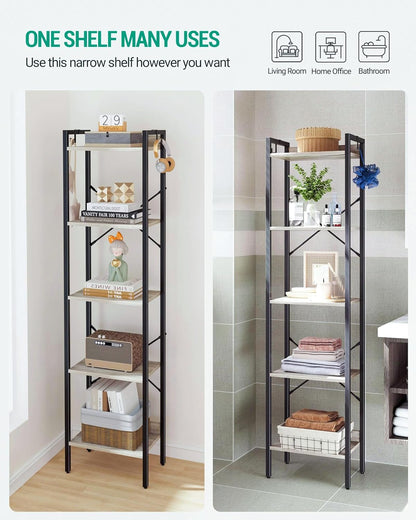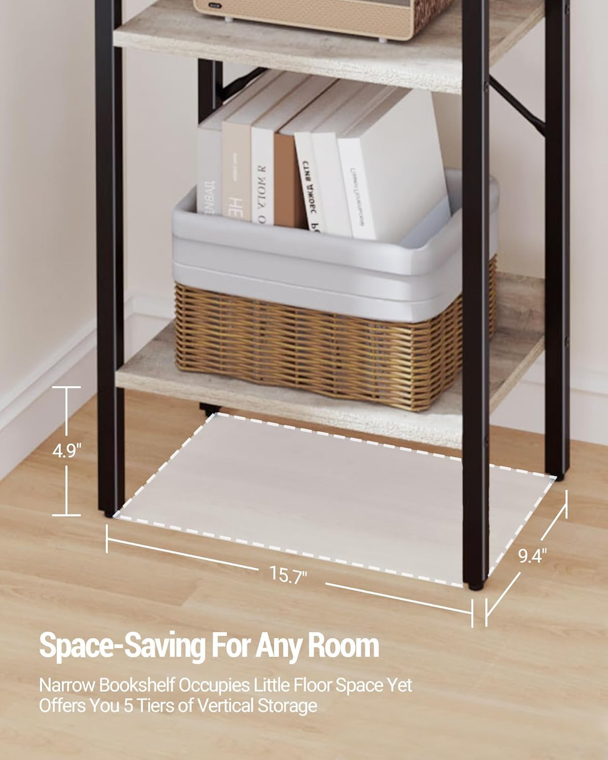 - [Space-Saving for Any Room] This 9.4"D×15.7"W×61"H narrow bookshelf occupies little floor space yet offers you 5 tiers of vertical storage, making full use of the small spaces in your home office, living room, Kitchen,bedroom, balcony or entryway