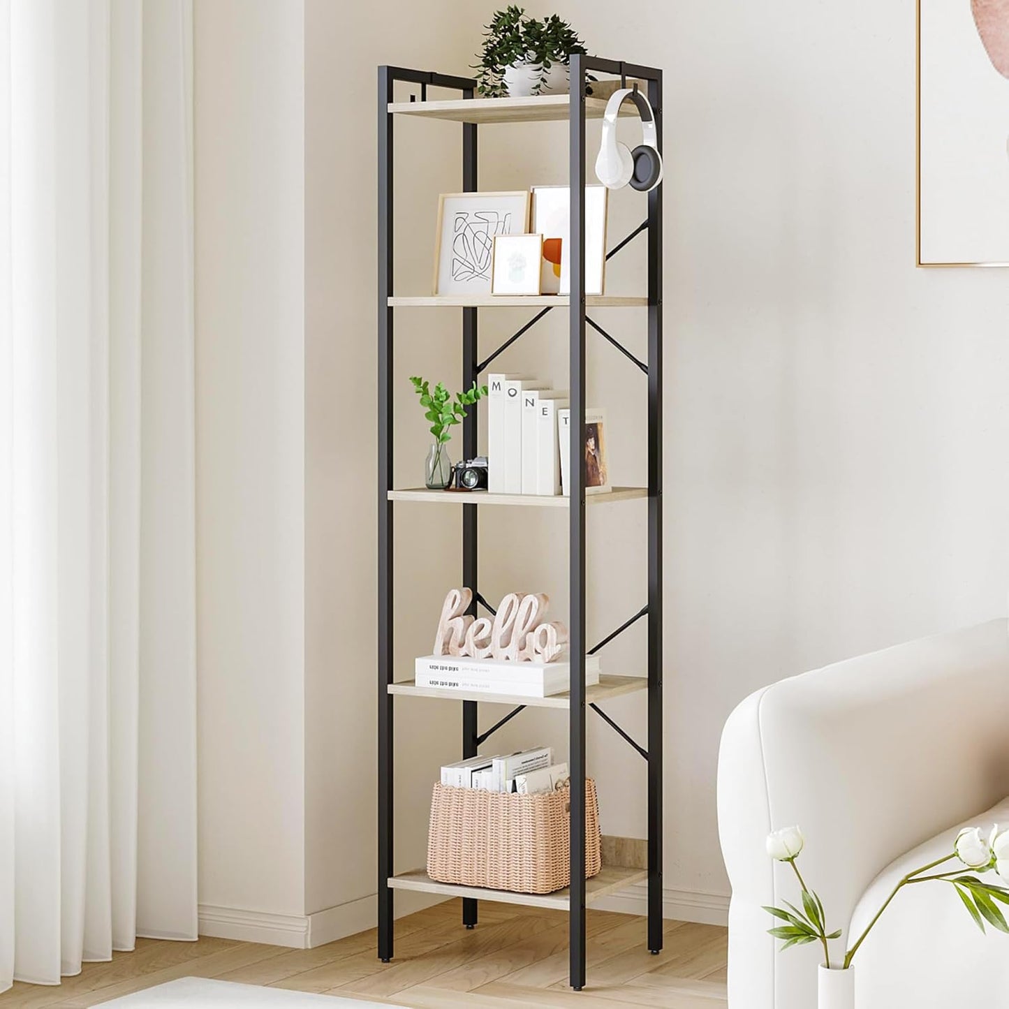 Industrial 5-Tier Bookshelf with Hooks - Greige Corner Storage Organizer for Home Office, Living Room, Bedroom, and Kitchen