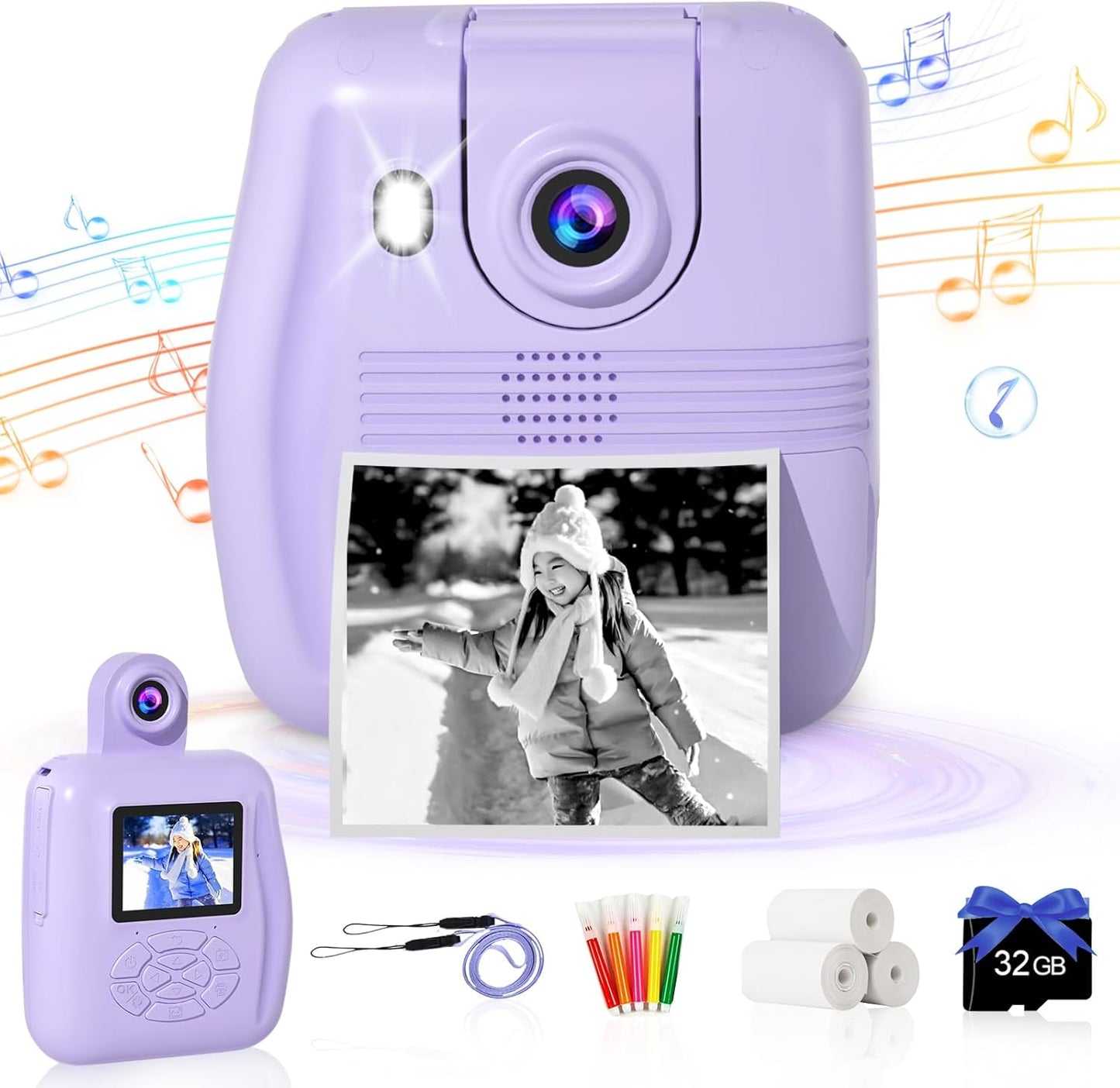 - Instant Print Camera for Kids - Toddler camera for girl boy adopts inkless thermal printer technology, easily operates to take pictures, print photos(3 Rolls Print Paper-300photos) and record videos. The portable kids camera with instant pictures comes with a lanyard to make children capture happy life anywhere more easily.1*32GB SD card has been inserted already.