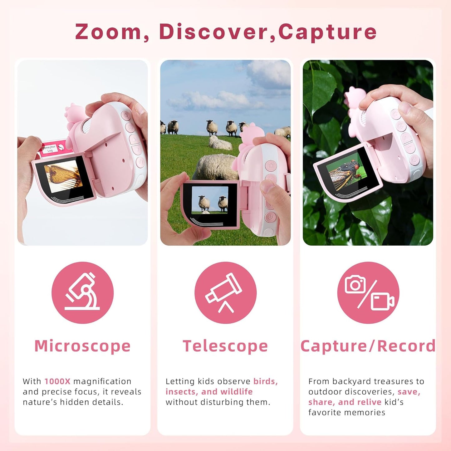 - 【🌎See Far, Explore More】When it’s time to explore the great outdoors, Dino effortlessly transforms into a telescope, bringing distant scenes to life on its vibrant 2" IPS color screen. Whether it’s observing birds, insects, or wildlife from afar, kids can enjoy a vivid and detailed view without disturbing the creatures they’re watching. From backyard adventures to exploring nature, Dino inspires young adventurers to step outside, embrace nature, and connect with the world around them.