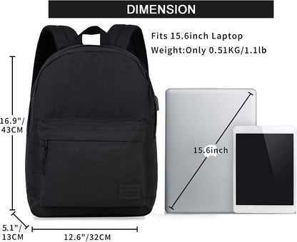 Lightweight Casual Laptop Backpack with USB Charging Port for Men and Women - Dark Black College Bookbag