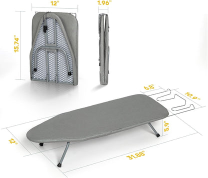 RAINHOL non-gap compact foldable ironing board with iron rest, steel frame, and metal mesh board is sturdy and durable. Its folding size is 15.74"L x 12" W x 1.96"H. This tabletop ironing board also with heat-resistant cotton pads for quick ironing needs, The non-slip folding stand keeps the countertop smooth, is easy to store, and saves space when needed. Small iron board is perfect for college dorms, travel, RVs, single occupancy apartments, and small laundry rooms.