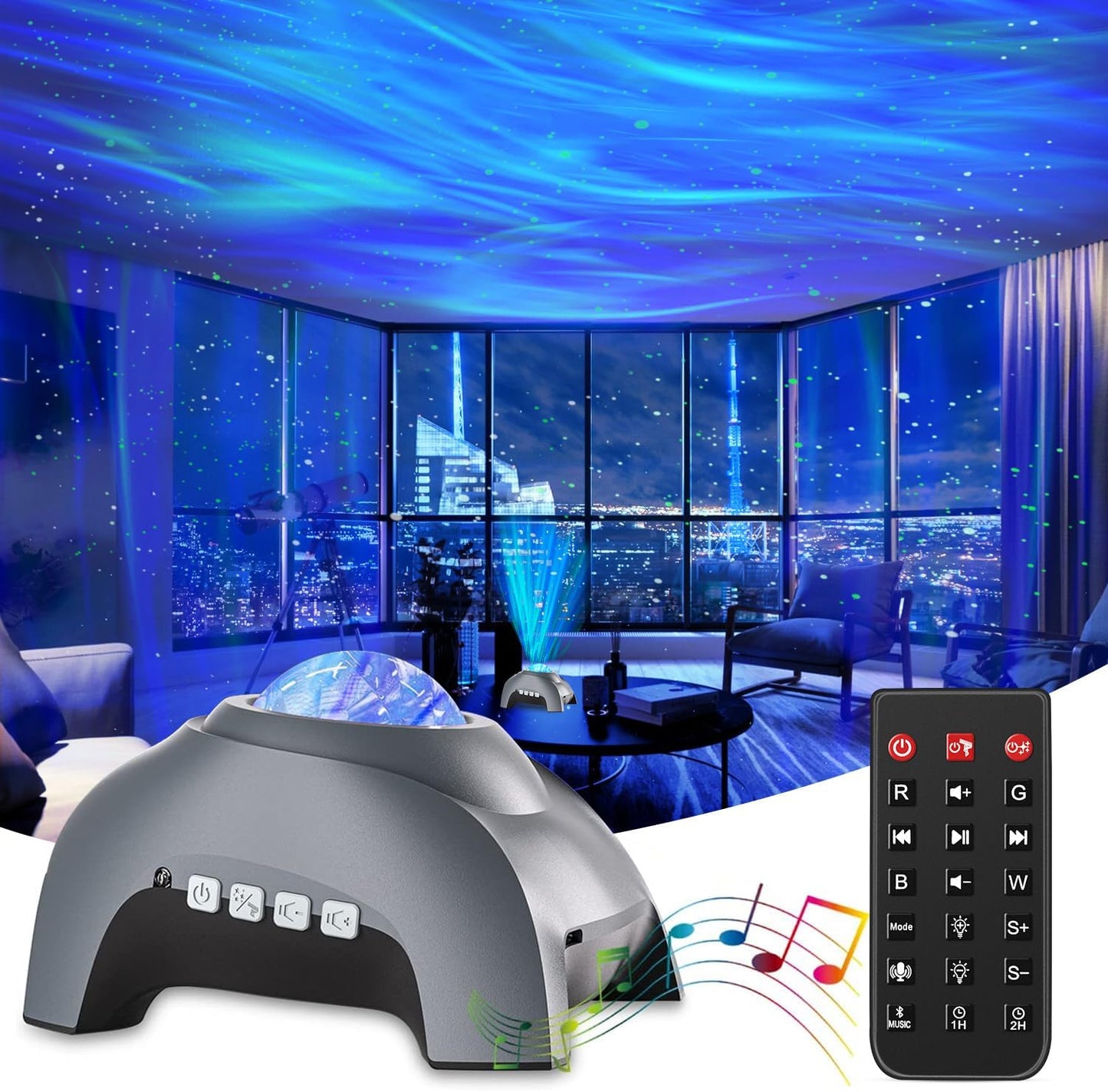 - [Remote Control & Auto Off Timer] The star projector comes with a remote control that can freely turn ON/OFF the aurora and starry sky, adjust brightness, change the lighting mode, speed, music, and volume. The star projector galaxy light also has an auto-off timer which you can set to turn off after 1 or 2 hours. No need to worry about leaving it on when trying to fall asleep. Will be off after 4 hours if forgot to set the timer but can be turned back on if want to continue to have it in use.
