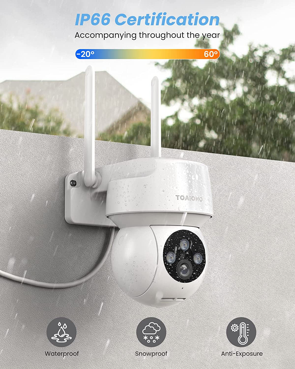 - 【Motion and sound detection and IP66】 Home camera can intelligently detect motion and sound. The security cameras wired outdoor will send a warning message to your mobile phone. You can adjust the sensitivity of the alarm. This reduces false alarms caused by leaves, rain, heavy snow, etc. It has IP66 waterproof certification. To some extent, it can resist extreme weather conditions such as heavy rain and snow.