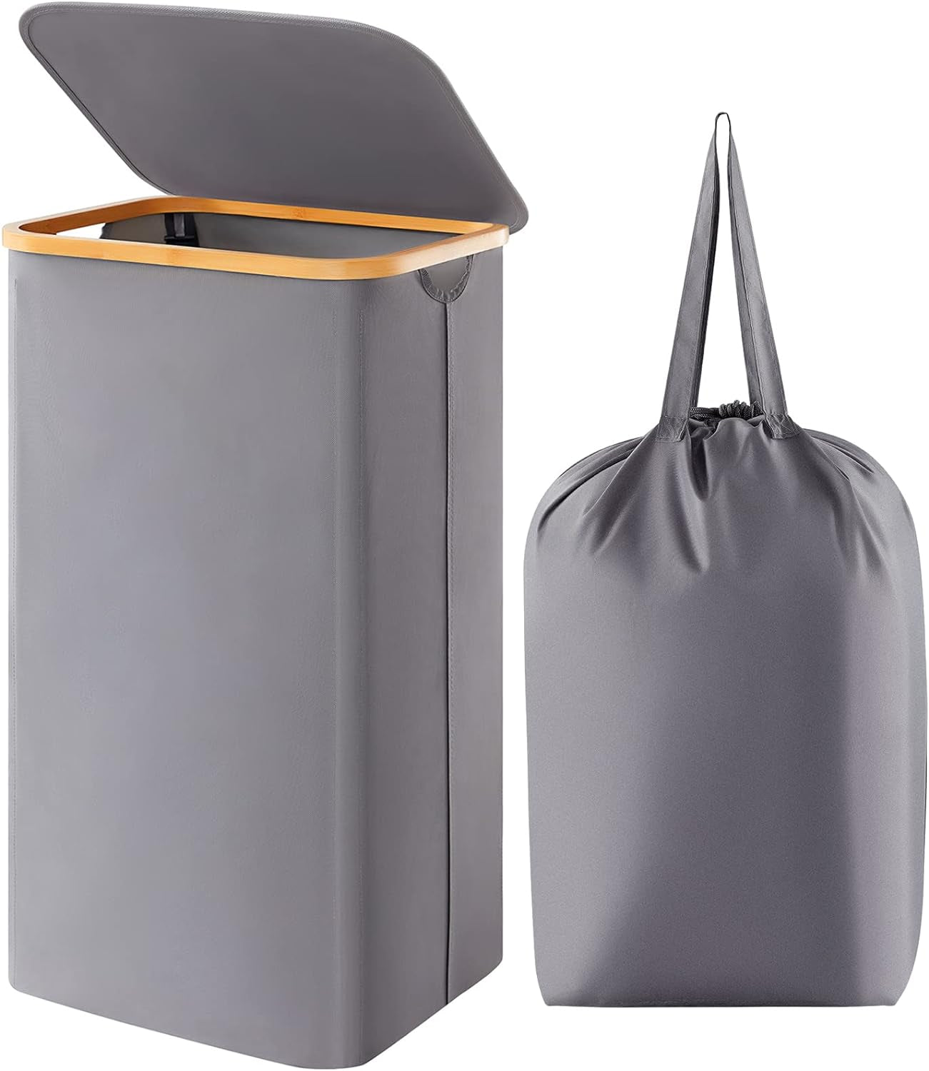 Premium Collapsible Laundry Hamper with Lid and Removable Bag, 100L Tall Storage Bin with Bamboo Handles - Black