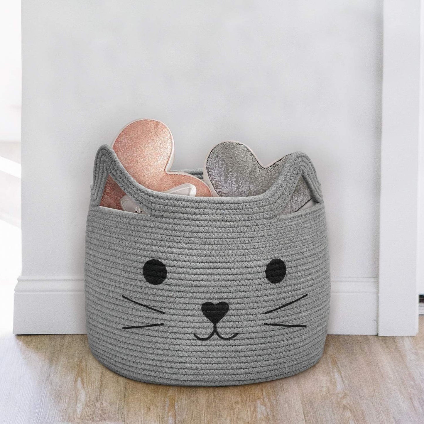 Large CapacityThe basket in large size which allows you to store many things like clothes, blankets, pillows, towels, toys and so on. Provide you with extra storage space. Make home clean and tidy. | Built-in HandlesHandles in cat ear shape make it cute and easy to carry from one place to another. By streghten the connecting part, the handle will not be broken even filling with heavy weight clothes. | Detailed SewingBaskets are made by our experienced craftsman. They're very careful when dealing with seam and details, which finally present a chic and perfect basket. |