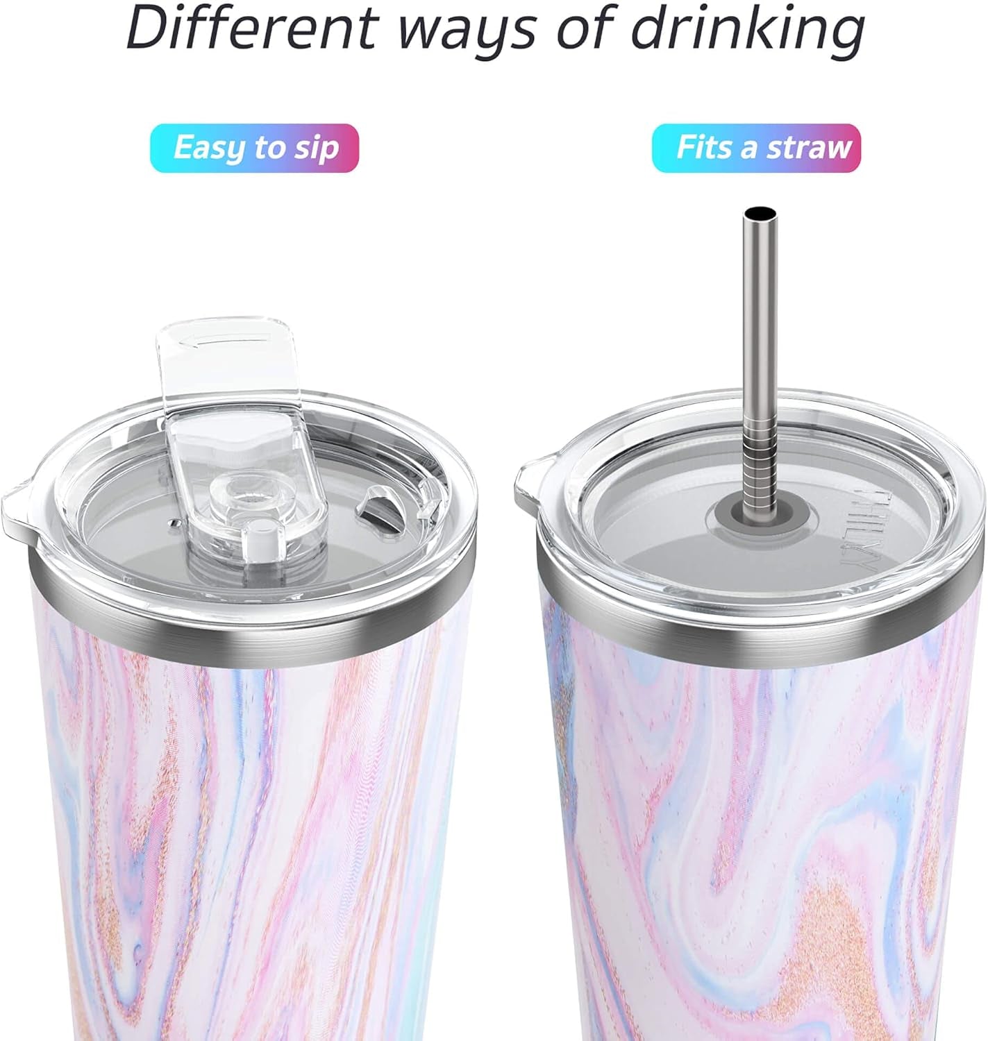 - EXCLUSIVE BONUS TWO UNIQUE LIDS - two lids will give you two special drinking options. The spill-proof lid rotates open for standard drinking, rotate back for spill-resistant travel. Another is the straw lid, just insert the straw through the middle of the lid. both lids are easy to clean. the package will also come with 2 metal reusable straws and a straw brush.